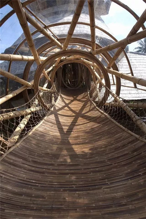 別墅的入口經(jīng)過一個(gè)非常具有戲劇性的隧道連橋,之后直接進(jìn)入到露天起居室及餐廳。戲劇性的空間讓它可以稱得上為一座奇幻主題樂園。