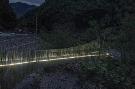 最終,在余姚中村小溪上架起的這座竹橋,僅花了 2.6 萬,其中 2.1 萬人工費,5000 元材料費。它造價低廉卻質(zhì)樸優(yōu)美,僅有 1.2 米的橋身剛好是足夠一人走、另一個人側(cè)身而過的尺度,到了晚上,小橋上安裝的燈帶散發(fā)著微光,為它增添了一分別樣的美感。